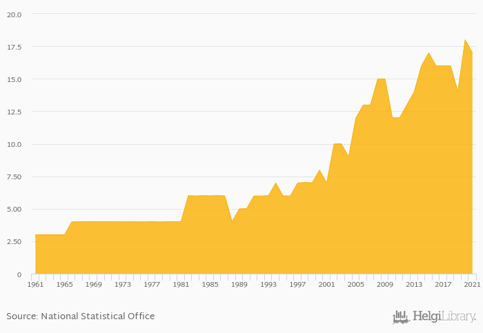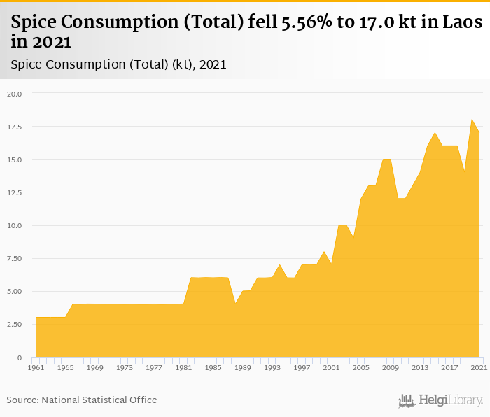 Total spice consumption fell 5.56% to 17.0 kt in Laos in 2021, according to Faostat.