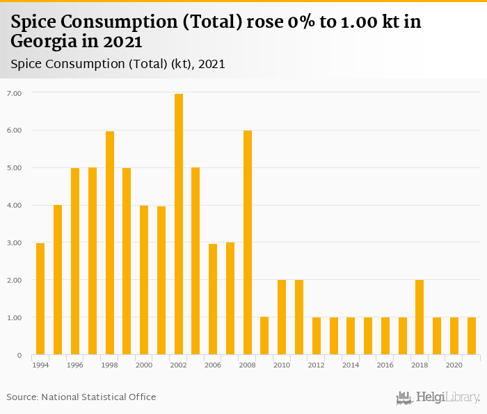 Total spice consumption rose 0% to 1.00 kt in Georgia in 2021, according to Faostat.