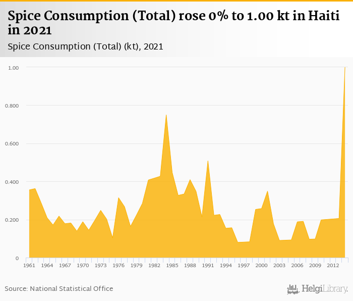 Total spice consumption rose 0% to 1.00 kt in Haiti in 2021, according to Faostat.