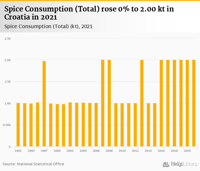 Total spice consumption rose 0% to 2.00 kt in Croatia in 2021, according to Faostat.