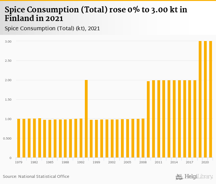 Historically, total spice consumption in Finland reached an all time high of 3.00 kt in 2021 and an all time low of 0.976 kt in 1984.