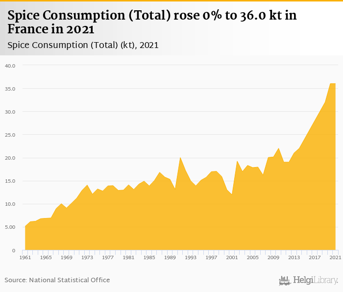 Total spice consumption rose 0% to 36.0 kt in France in 2021, according to Faostat.