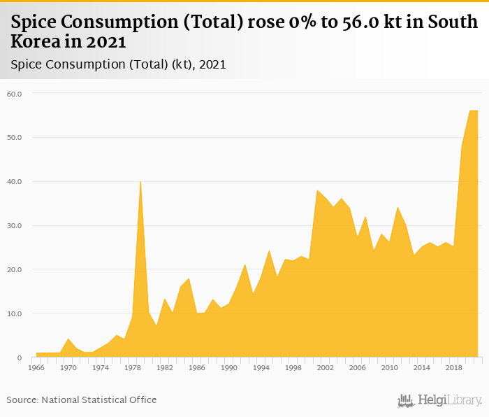 Total spice consumption rose 0% to 56.0 kt in South Korea in 2021, according to Faostat.