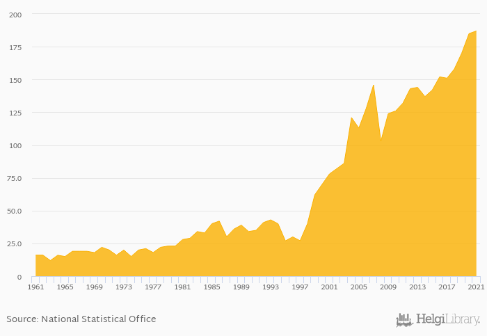 Historically, total spice consumption in Malaysia reached an all time high of 187 kt in 2021 and an all time low of 12.0 kt in 1963.