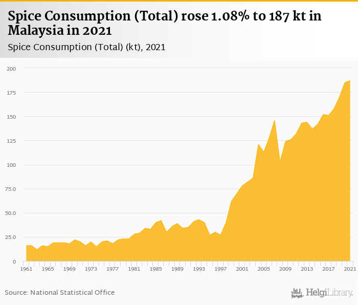 Total spice consumption rose 1.08% to 187 kt in Malaysia in 2021, according to Faostat.