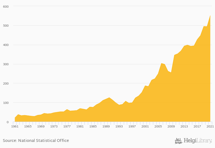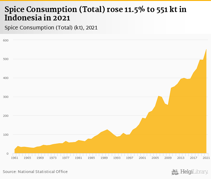 Historically, total spice consumption in Indonesia reached an all time high of 551 kt in 2021 and an all time low of 20.0 kt in 1961.