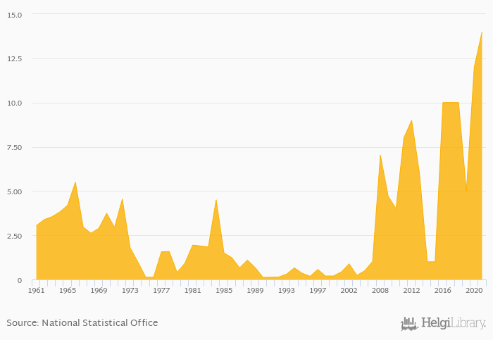 Historically, total spice consumption in Afghanistan reached an all time high of 14.0 kt in 2021 and an all time low of 0.117 kt in 1990.