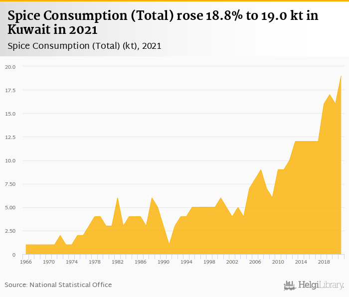 Total spice consumption rose 18.8% to 19.0 kt in Kuwait in 2021, according to Faostat.