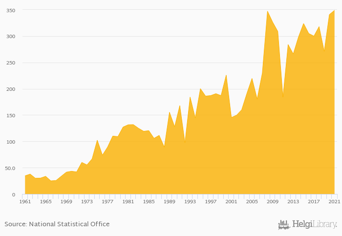 Historically, total spice consumption in Pakistan reached an all time high of 349 kt in 2021 and an all time low of 25.0 kt in 1966. When compared to Pakistan's main peers, total spice consumption in Afghanistan amounted to 14.0 kt, 703 kt in China, 5,394 kt in India and 66.0 kt in Iran in 2021.