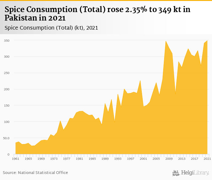 Total spice consumption rose 2.35% to 349 kt in Pakistan in 2021, according to Faostat.