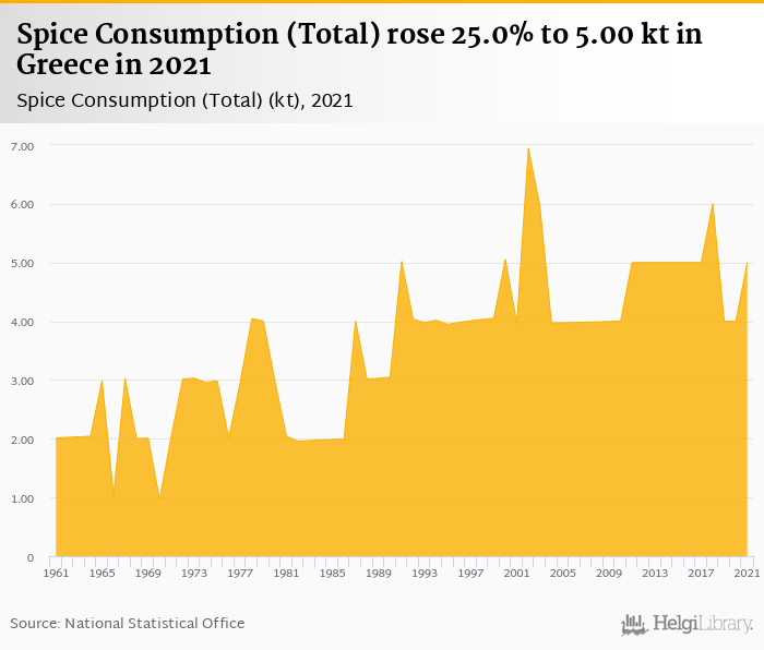 Total spice consumption rose 25.0% to 5.00 kt in Greece in 2021, according to Faostat.
