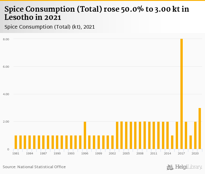 Historically, total spice consumption in Lesotho reached an all time high of 8.00 kt in 2017 and an all time low of 0.991 kt in 1997. When compared to Lesotho's main peers, total spice consumption in Botswana amounted to 6.00 kt, 35.0 kt in South Africa, 3.00 kt in Swaziland and 2.00 kt in Zimbabwe in 2021.