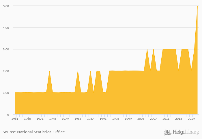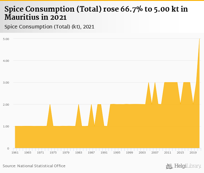 Historically, total spice consumption in Mauritius reached an all time high of 5.00 kt in 2021 and an all time low of 0.995 kt in 1985.