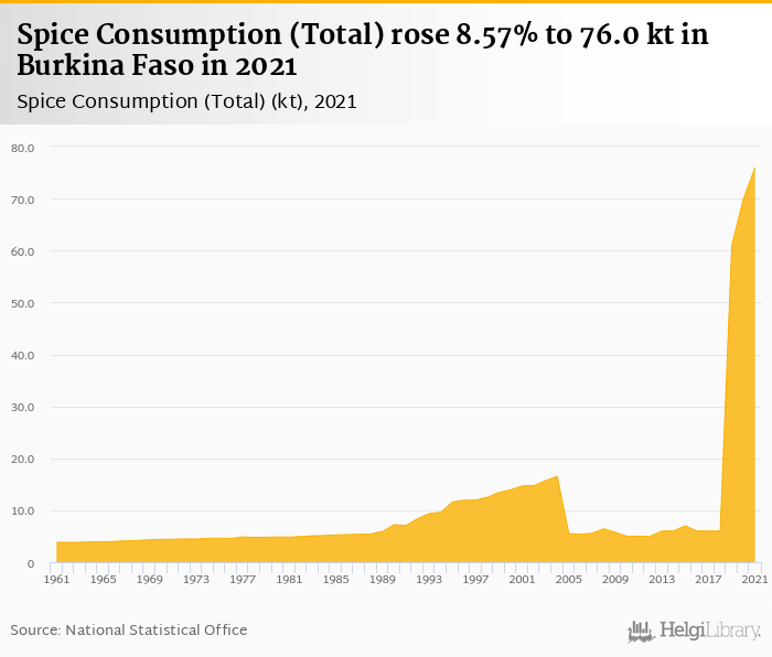 Total spice consumption rose 8.57% to 76.0 kt in Burkina Faso in 2021, according to Faostat.