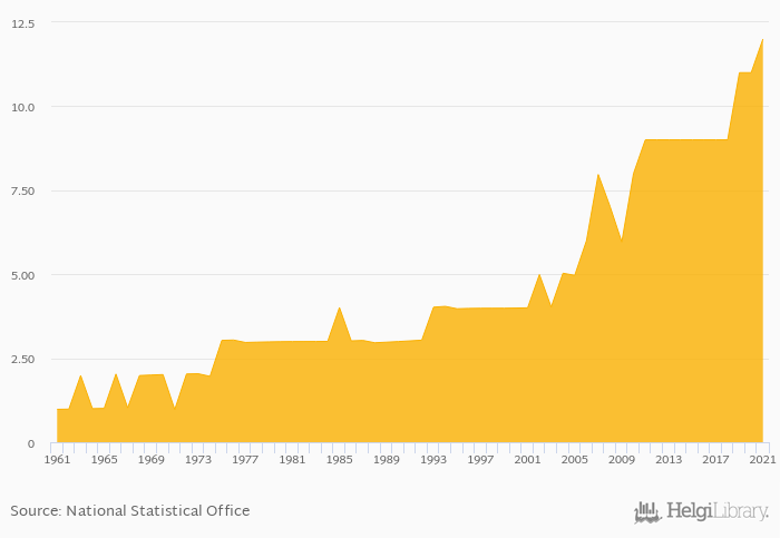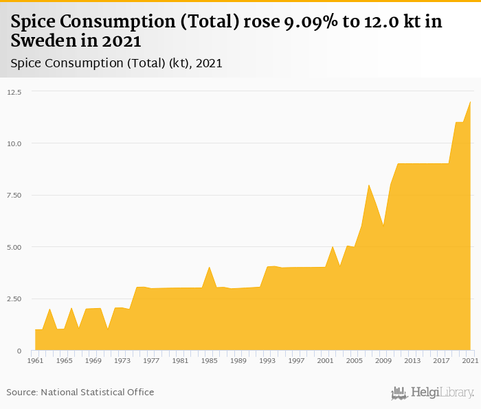 Total spice consumption rose 9.09% to 12.0 kt in Sweden in 2021, according to Faostat.