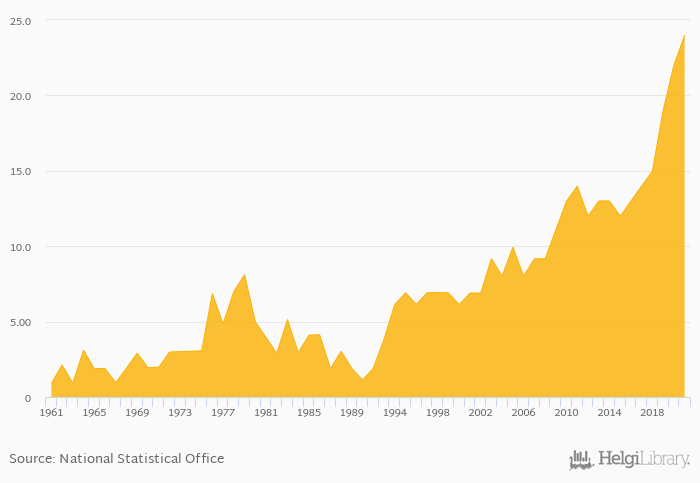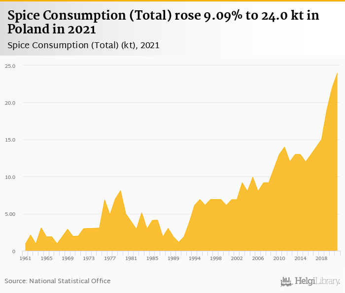 Total spice consumption rose 9.09% to 24.0 kt in Poland in 2021, according to Faostat.