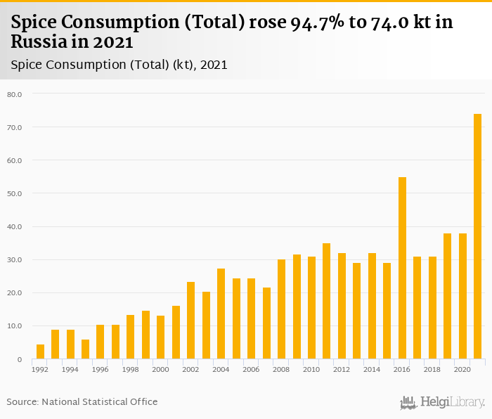 Total spice consumption rose 94.7% to 74.0 kt in Russia in 2021, according to Faostat.