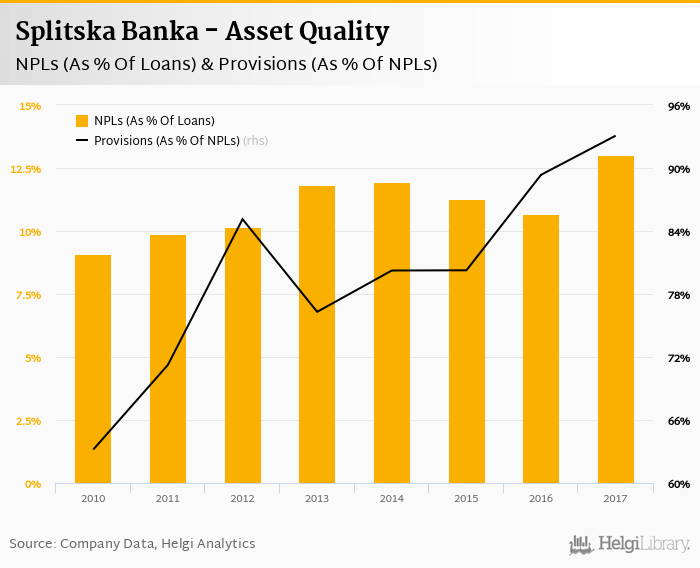 Comparing Splitska Banka with its closest peers, Zagrebacka Banka operated at the end of 2017 with NPL ratio of 11.4% and provision coverage of 73.4%, Splitska Banka with 13.0% and 93.1% respectively and Privredna Banka Zagreb had 8.96% of bad loans covered with 62.2% by provisions at the end of 2017.