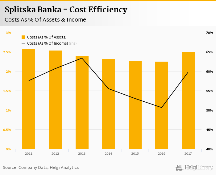 Splitska Banka's cost to income ratio reached 59.8% in 2017, up from 50.6% compared to the previous year.