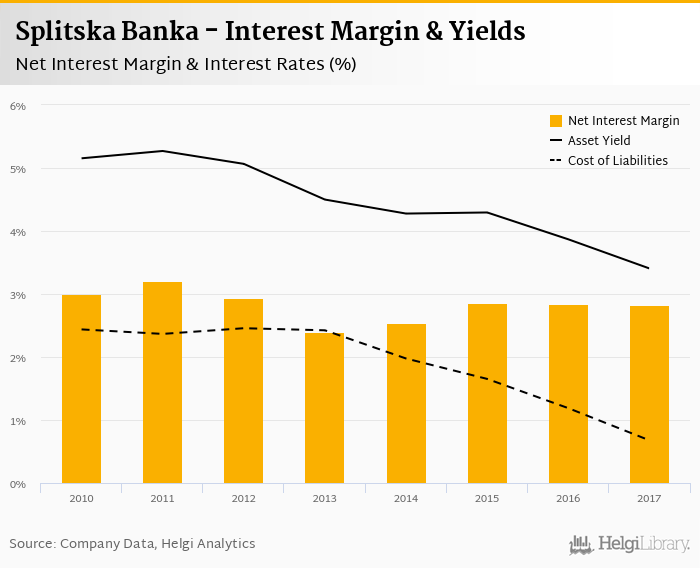 Comparing Splitska Banka with its closest peers, Zagrebacka Banka operated in 2017 with a net interest margin of 2.80% in 2017, Splitska Banka reached 2.82% and Privredna Banka Zagreb some 2.94%.