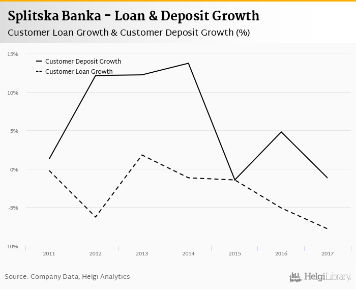 At the end of 2017, Splitska Banka's loans accounted for 71.9% of total deposits and 55.2% of total assets.