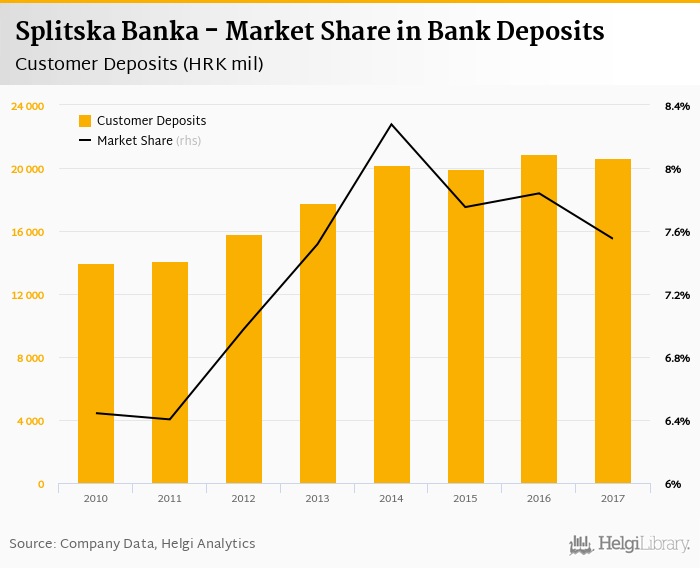 Splitska Banka accounted for 7.55% of all customer deposits taken by banks in Croatia at the end of 2017. Historically, the bank’s market share in customer deposits reached an all time high of 8.28% in 2014 and an all time low of 6.40% in 2011.