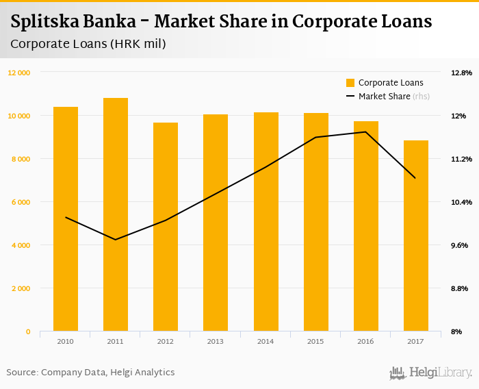Splitska Banka's corporate loans reached HRK 8,855 mil in 2017, down 9.13% compared to the previous year.