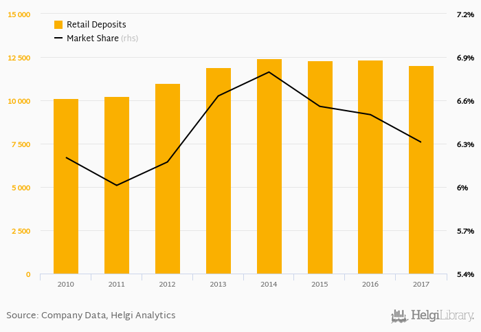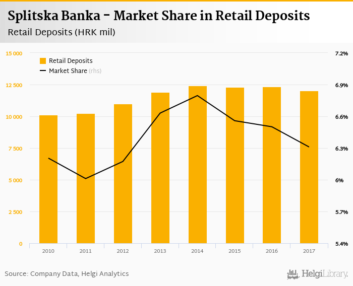 Splitska Banka accounted for 6.31% of all retail deposits taken by banks in Croatia at the end of 2017. Historically, the bank’s market share in retail deposits reached an all time high of 6.80% in 2014 and an all time low of 6.01% in 2011.
