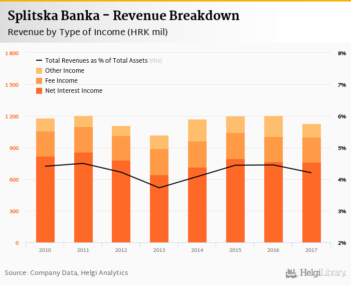 Comparing Splitska Banka with its closest peers, Zagrebacka Banka generated total revenues of 4.30% of assets in 2017, Splitska Banka operated with 4.20% revenue margin and Privredna Banka Zagreb produced total income worth 4.77% of assets.