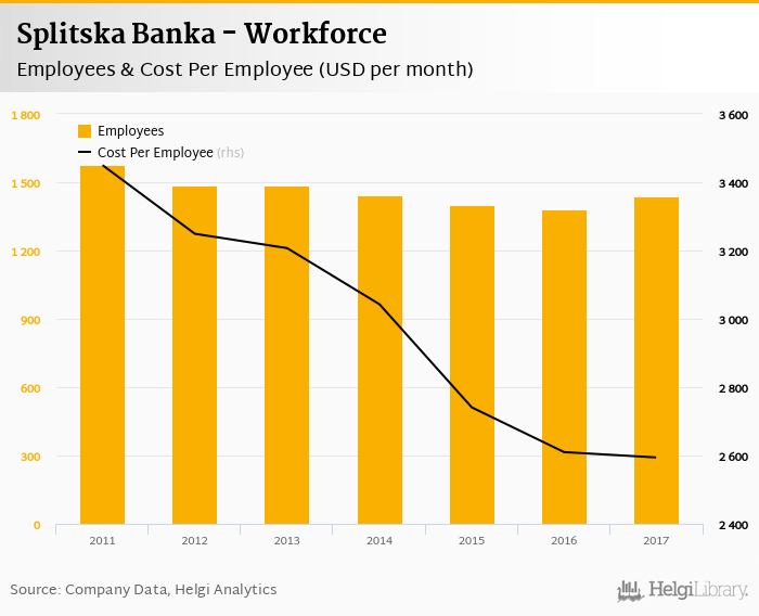 Splitska Banka employed 1,439 persons in 2017, up 4.28% when compared to the previous year. Historically, the bank's workforce hit an all time high of 1,576 persons in 2011 and an all time low of 1,380 in 2016.