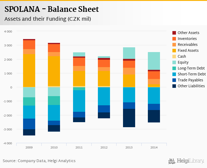 SPOLANA's total assets reached CZK 1,246 mil at the end of 2014, down 38.4% compared to the previous year.