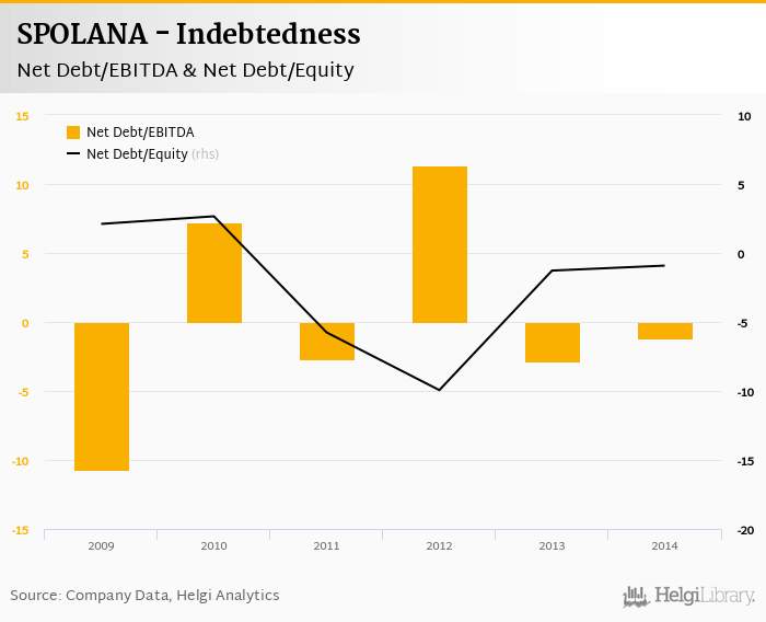 SPOLANA's net debt stood at CZK 1,158 mil and accounted for -0.917 of equity at the end of 2014. The ratio is up 0.361 pp compared to the previous year.