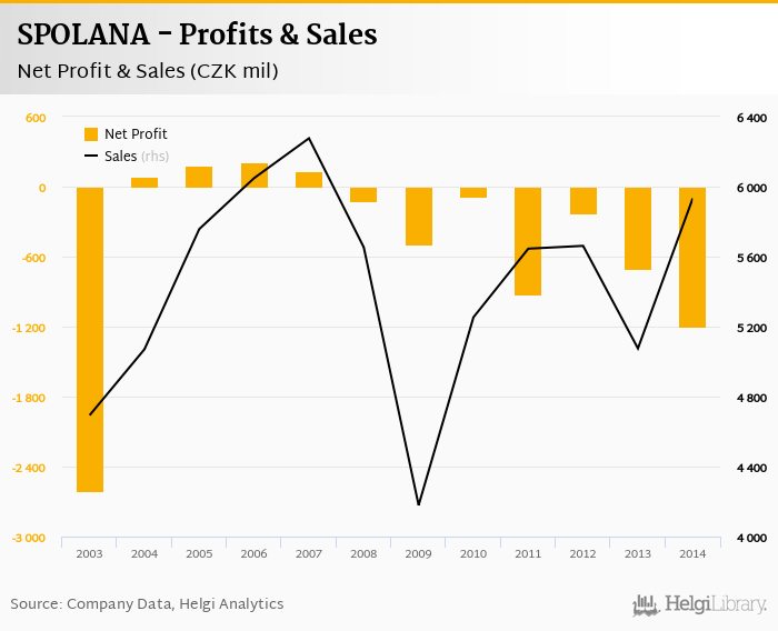 SPOLANA made a net profit of CZK -1,203 mil in 2014, down 69.7% compared to the previous year. Total sales reached CZK 5,933 mil, which is up 16.9% when compared to the previous year.