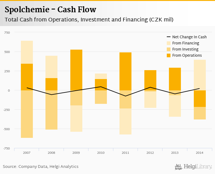 Cash from financing amounted to CZK 397 mil, so the company generated CZK 20.6 mil net cash in 2014.