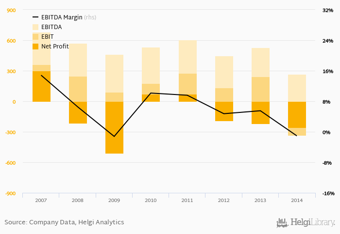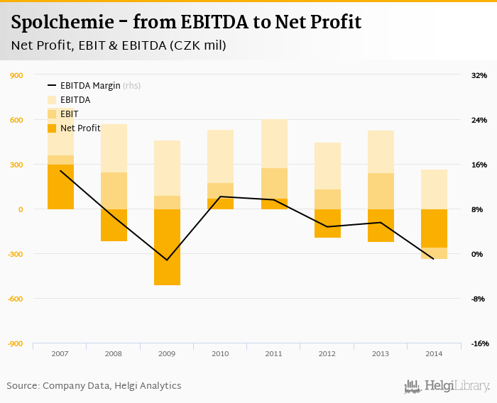 Spolchemie made a net profit of CZK -256 mil with revenues of CZK 6,179 mil in 2014, down by 16.6% and up by 10.9%, respectively, compared to the previous year. This translates into a net margin of -4.14%.