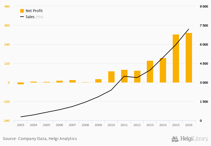 Sales have grown by 24% a year on average since 2006. They reached a high of CZK 7,201 mil in 2016 and a low of CZK 273 mil in 2003.