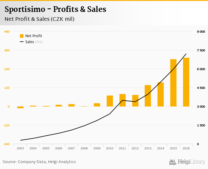 Sportisimo made a net profit of CZK 312 mil in 2016, up 2.81% compared to the previous year. Total sales reached CZK 7,201 mil, which is up 20.6% when compared to the previous year.