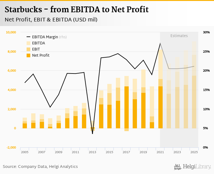 Starbucks made a net profit of USD 4,393 mil with revenues of USD 30,362 mil in 2021, up by 561% and up by 31%, respectively, compared to the previous year. This translates into a net margin of 14.5%.