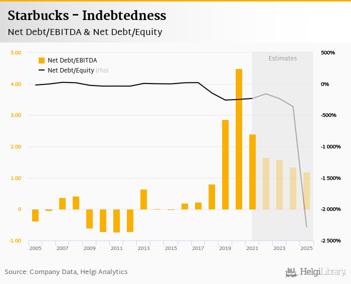 Starbucks's net debt stood at USD 19,690 mil and accounted for -233% of equity at the end of 2021. The ratio is up 15.9 pp compared to the previous year.