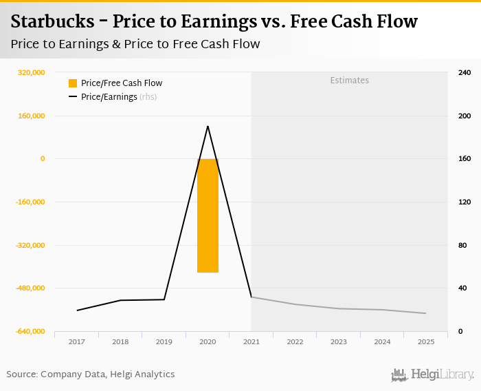 Regarding cash generated defined by the sum of net profit and depreciation, the stock traded at 24.5x at the end of 2021. When investments are excluded to get free cash flow, Starbucks traded at 24.9x.