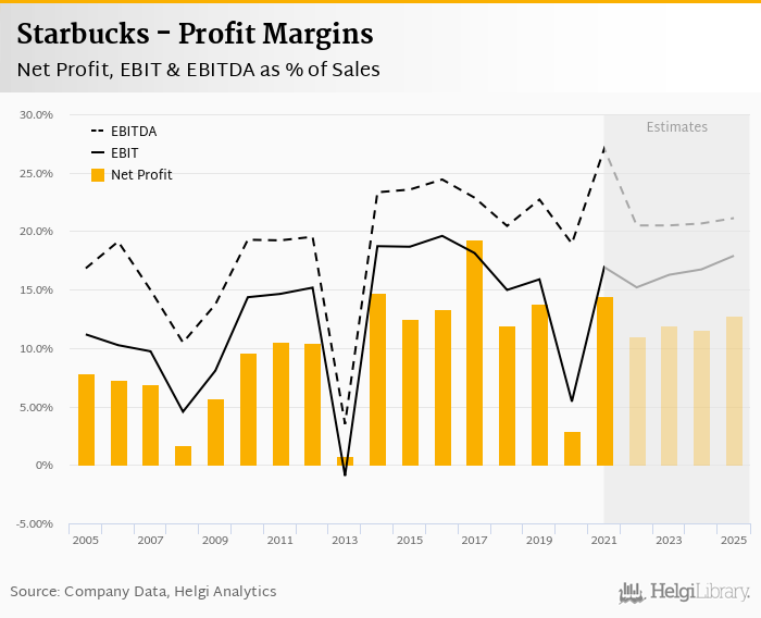 Starbucks made a net profit of USD 4,393 mil with revenues of USD 30,362 mil in 2021, up by 561% and up by 31.0%, respectively, compared to the previous year.