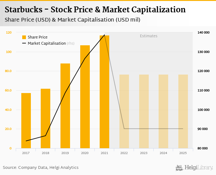 Starbucks stock traded at USD 117 per share at the end 2021 implying a market capitalization of USD 138,704 mil.