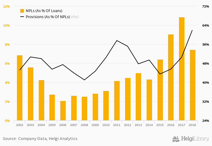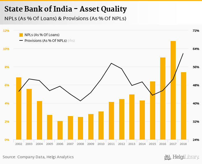 State Bank of India's non-performing loans reached 7.44% of total loans at the end of 2018, down from 10.9% compared to the previous year. Historically, the NPL ratio hit an all time high of 10.9% in 2017 and an all time low of 2.06% in 2006.