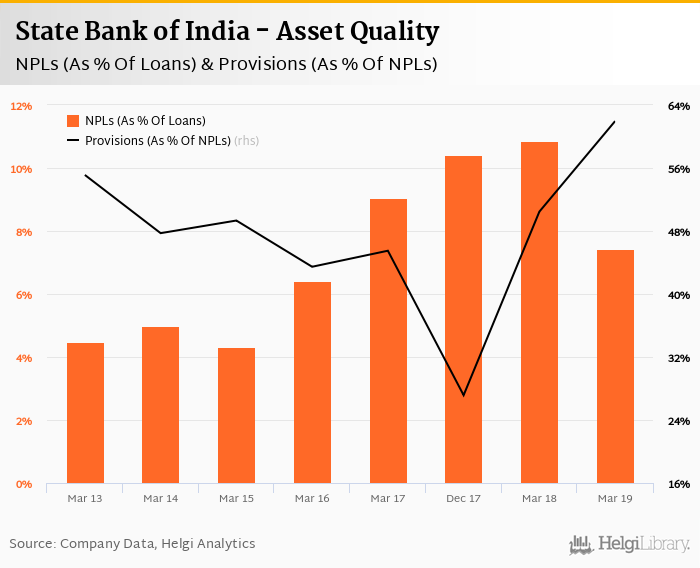 State Bank of India's non-performing loans reached 7.44% of total loans at the end of 2019-03-31, down from 10.9% compared to the previous year. Historically, the NPL ratio hit an all time high of 10.9% in 2018-03-31 and an all time low of 4.32% in 2015-03-31.