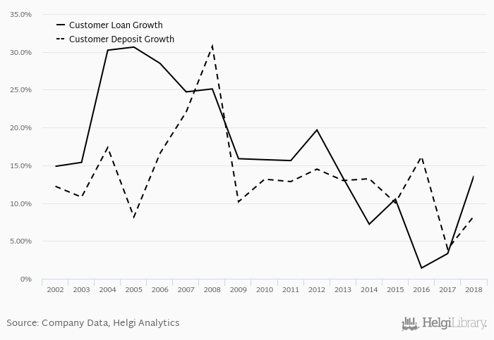 On the other hand, bank's customer deposit growth amounted to 8.28% at the end of 2018, up from 3.93% when compared to the previous year. Historically, the bank’s deposit growth reached an all time high of 30.7% in 2008 and an all time low of 3.93% in 2017. In the last decade, the average annual loan growth amounted to 11.5%.