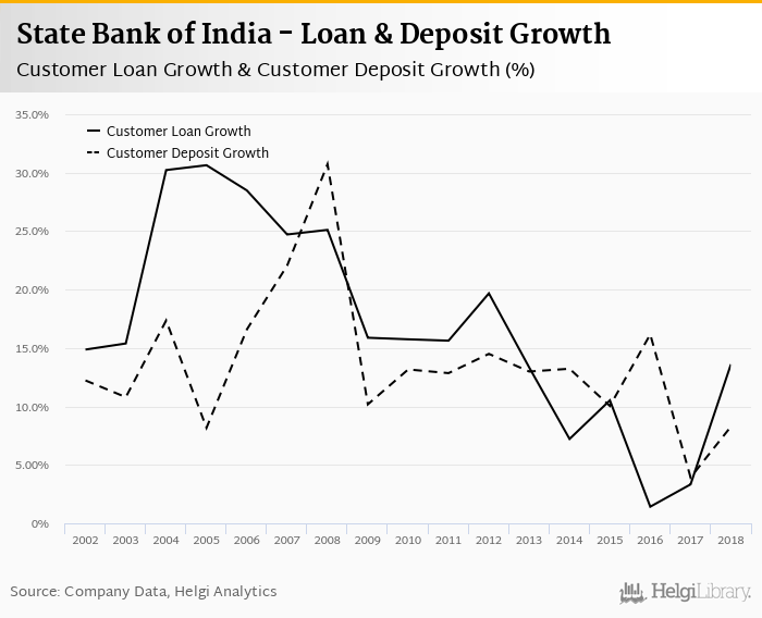 State Bank of India's customer loan growth reached 13.6% in 2018, up from 3.33% compared to the previous year. Historically, the bank’s loans growth reached an all time high of 30.6% in 2005 and an all time low of 1.42% in 2016. In the last decade, the average annual loan growth amounted to 11.5%.