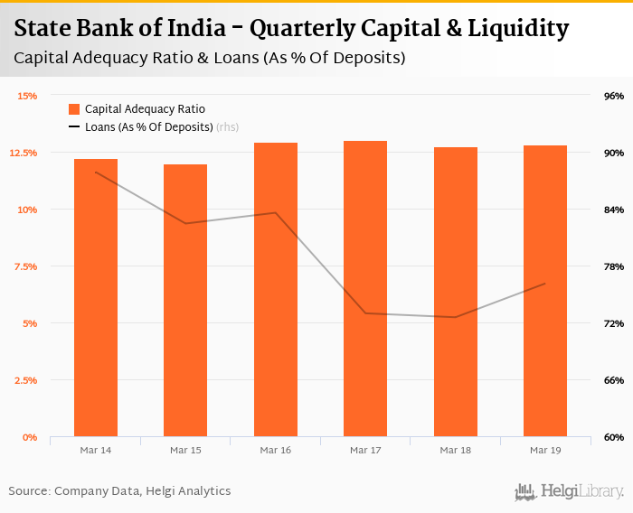 State Bank of India's capital adequacy ratio reached 12.8% at the end of first quarter of 2019, up from when compared to the previous quarter. Historically, the bank’s capital ratio hit an all time high of 13.0% in 1Q2017 and an all time low of 12.0% in 1Q2015.