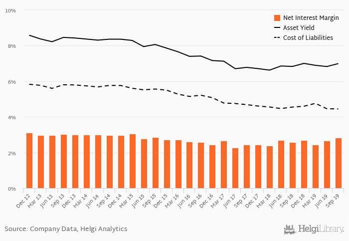 Historically, the bank’s net interest margin reached an all time high of 3.12% in 4Q2012 and an all time low of 2.28% in 2Q2017. The average margin in the last six quarters amounted to 2.64%.