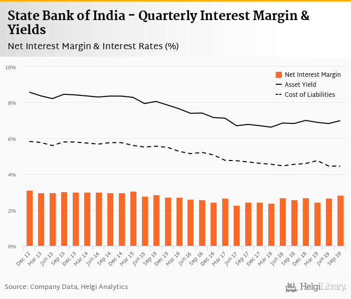State Bank of India's net interest margin amounted to 2.83% in the third quarter of 2019, up from 2.65% when compared to the previous quarter.
