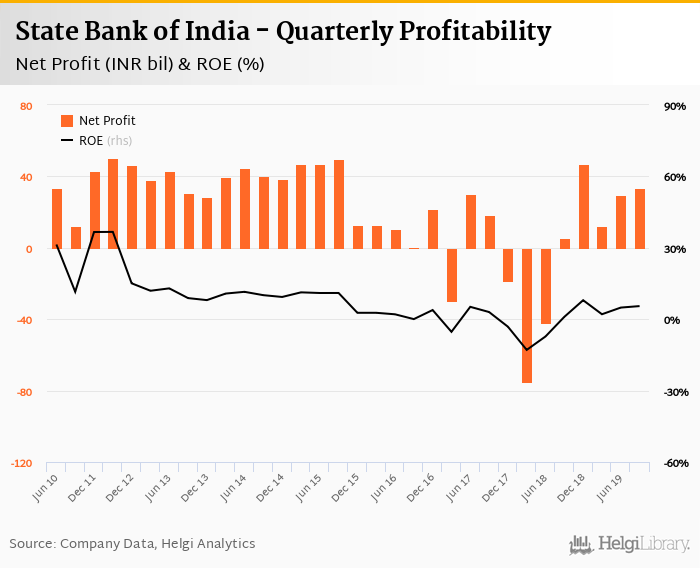 State Bank of India made a net profit of INR 33.8 bil in the third quarter of 2019, up 486% when compared to the same period of last year. This implies a return on equity of 5.50%.